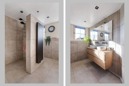 Eerste verdieping: overloop met laminaatvloer en vaste kastenwand, 4 slaapkamers waarvan 1 met wastafel, badkamer met dakkapel, v.v. inloopdouche, sun shower, toilet en wastafelmeubel met 2 waskommen, 5de ruime slaapkamer met vaste kasten en cv-opstelling doorgang naar 6de slaapkamer met opbergkast.