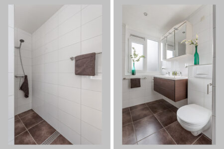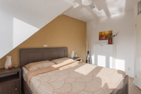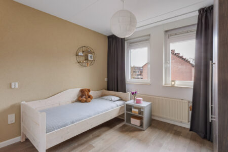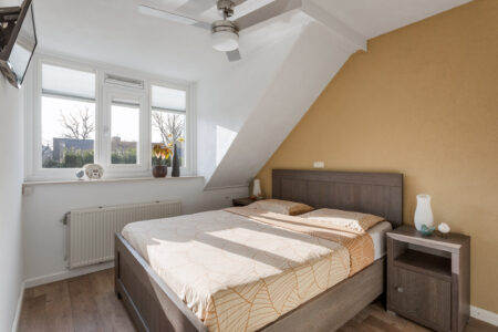 Eerste verdieping: overloop met garderobekast, 3 slaapkamers waarvan 1 met dakkapel, eigentijdse badkamer met dakkapel, inloopdouche, toilet en wastafelmeubel.