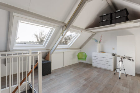 Tweede verdieping: vaste trap naar bergzolder met knieschotten, cv-opstelling en 2 kunststof dakramen, fijne ruimte voor een 4 de (slaap)kamer.