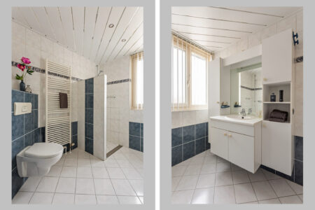 Eerste verdieping: overloop, 3 slaapkamers, badkamer v.v. inloopdouche, toilet, wastafelmeubel en designradiator.