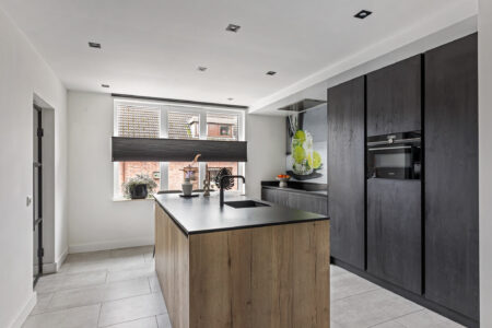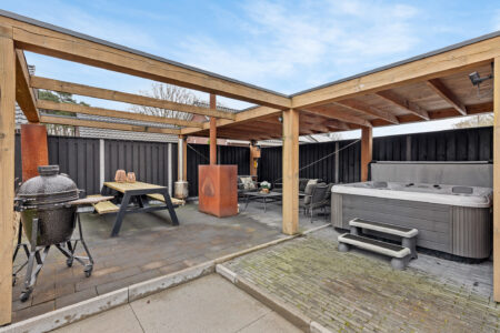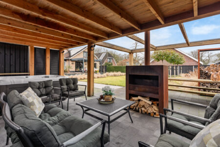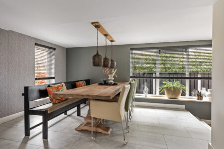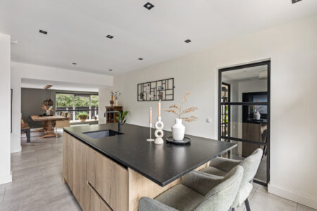 De moderne woonkeuken is uitgerust met een spoeleiland en hoogwaardige inbouwapparatuur, waaronder een inductiekookplaat, vaatwasser, koel-/vriescombinatie, Quooker en combimagnetron. De gezellige eethoek vormt het hart van de woning en verbindt de keuken met de living. De sfeervolle woonkamer, bereikbaar via twee traptreden is voorzien van een visgraatvloer, gashaard en openslaande tuindeuren naar de overkapping. Vanuit de living bereikt u een tussenhal met vaste kast en tweede toilet, alsmede het tochtportaal/achteringang. Hier vindt u tevens een doucheruimte met wastafel en de binnendoor verbinding naar de garage/berging, tuin en het terras.
