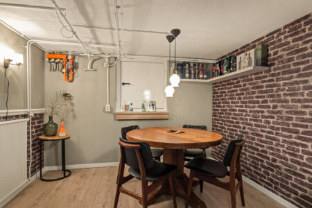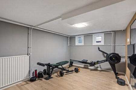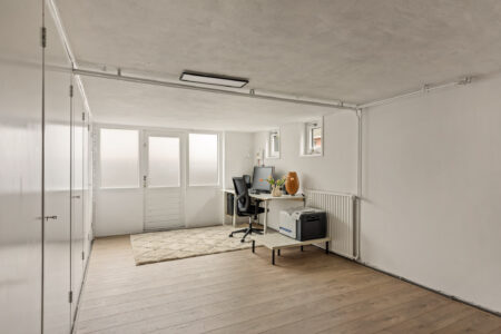 Het souterrain beschikt over een hal met toegang tot een mancave en fitnessruimte, een technische ruimte met warmtepomp en wasmachineaansluiting en een kantoor-/hobbyruimte met kastenwand en een loopdeur naar buiten. Deze ruimte is uitermate geschikt voor bijvoorbeeld een kantoor of salon aan huis.