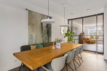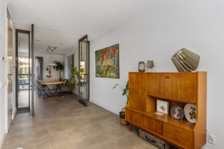 Begane grond: entree, hal, toilet met fontein, meterkast, trapopgang en trapkast. De zonnige woonkamer in L-vorm staat via plafondhoge taatsdeuren in verbinding met de tuingerichte woonkeuken. De moderne woonkeuken is voorzien van een spoel-/kookschiereiland en hoogwaardige inbouwapparatuur, waaronder een stoomoven, Quooker, koelkast, vaatwasser en een geïntegreerde inductiekookplaat met afzuiging. Vanuit de keuken openen de tuindeuren naar het terras en is er een doorgang naar de geïsoleerde berging met praktische loopdeur.
