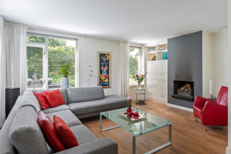 Begane grond: riante entree met garderobe, meterkast en toilet (vernieuwd in 2010) met fontein. De sfeervolle woonkamer is voorzien van een parketvloer, een gezellige open haard en een wand die dient als soort roomdivider die de zit- en eethoek subtiel van elkaar scheidt. Via de woonkamer bereikt u de serre, waar u in alle seizoenen kunt genieten van het uitzicht op de tuin. De royale woonkeuken is uitgerust met hoogwaardige inbouwapparatuur en grenst aan een praktische bijkeuken met kastenwand, uitstortgootsteen, witgoedaansluitingen en een achteringang. Vanuit de hal heeft u toegang tot een tweede toilet met fontein, een lees-/werkkamer, een riante slaapkamer met inloopkast en een moderne badkamer voorzien van designradiator, vloerverwarming, dubbele wastafel en stoom-/douchecabine.