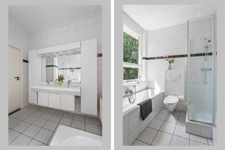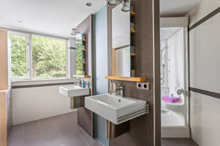 Eerste verdieping: ruime vide en overloop met cv-opstelling. Tweede badkamer met ligbad, dubbele wastafel, inloopdouche en derde toilet. Er zijn maar liefst vijf (slaap)kamers, waarvan één met kastenwand en opbergzolder. Daarnaast zijn er 2 inpandige bergingen waarvan een met tweede cv-ketel, ideaal voor spullen die u niet dagelijks nodig heeft.